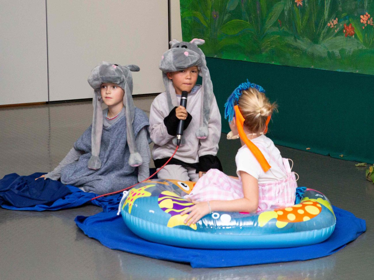 Extra für diesen besonderen Anlass hatte die Klasse 2b unter der Leitung von Frau Barbara Schmid das Theaterstück „Ich bin ich“ einstudiert. Gebannt und aus erster Reihe folgten die neuen Erstklässler der liebevoll inszenierten Reise des „Ichs“, welches auf der Suche nach Zugehörigkeit ist. So trifft es viele Tiere – Fische, Pferde, Hunde und Papageien – und entdeckt an ihnen Gemeinsamkeiten. Mal hat das „Ich“ dieselben Ohren wie ein Dackel, dasselbe Fell wie ein Pferd oder denselben Schwanz eines Papageis und fragt sich, ob es nun zu ihnen gehört. Enttäuscht muss es jedoch feststellen, dass die Unterschiede doch jedes Mal zu groß sind. Immer stimmt etwas nicht überein. Ganz niedergeschlagen fragt sich das „Ich“, wo es nun hingehört, als ihm plötzlich die Erkenntnis kommt. „Ich bin ich!“ Es ist einzigartig und das ist nicht nur vollkommen in Ordnung, sondern macht ihn zu etwas Besonderem. Und trotz oder gerade wegen dieser Einzigartigkeit wird es herzlich von allen Tieren in deren Mitte aufgenommen. Denn: „Du bist du!“