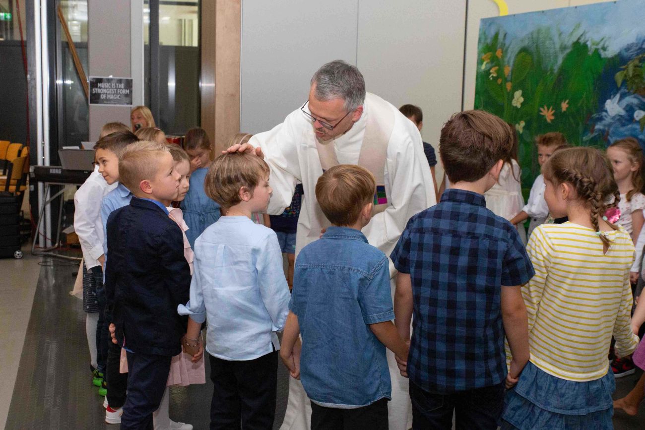 Pfarrer Timo Weber leitete den feierlichen Gottesdienst und gab den Kindern Gottes Wort mit auf den Weg, sprach das Gebet und segnete jedes Kind. Er nahm die Sorgen, Ängste und Erwartungen der Erstklässler vor diesem großen Schritt in die Schule auf und spendete ihnen gleichzeitig Mut und Hoffnung. So wie ein Regenschirm uns vor dem Regen schützt, so behütet uns Gott und hält schützend seine Hand über uns.