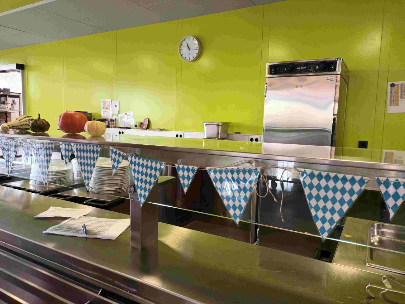Unsere Mensa verwandelte sich zu einem kleinen Festzelt mit bayrischer Dekoration. Die Tische und die Essensausgabe wurden mit blau-weißer Deko, Lebkuchenherzen, Salzstangen und Brezeln dekoriert, was ein willkommener Nachtisch für unsere Schüler war. Unser Chefkoch Peter Gulde kredenzte uns dazu eine Woche lang kulinarische Köstlichkeiten wie Brathändl, Leberkäs, Germknödel und vieles mehr. Die Schüler ließen es sich nicht nehmen und stiegen direkt freudig in die bayrische Woche mit ein, indem sie mit Dirndl oder Lederhosen in die Schule kamen. Dabei fühlten sich auch einige Mitarbeiter animiert so in die Schule zu kommen. Natürlich durfte die passende Musik nicht fehlen und so lief in der Mensa Blasmusik. Hierbei sangen sogar einige Schüler mit und schunkelten passend zur Musik.