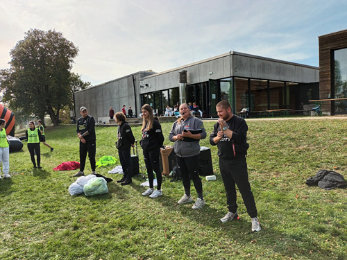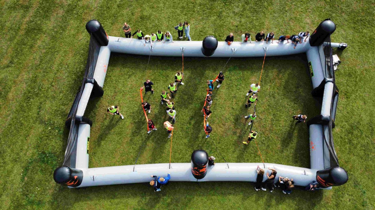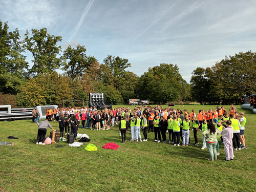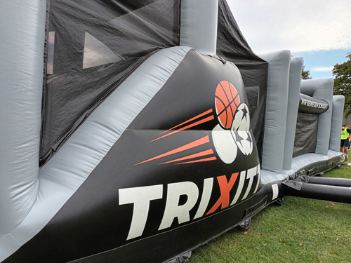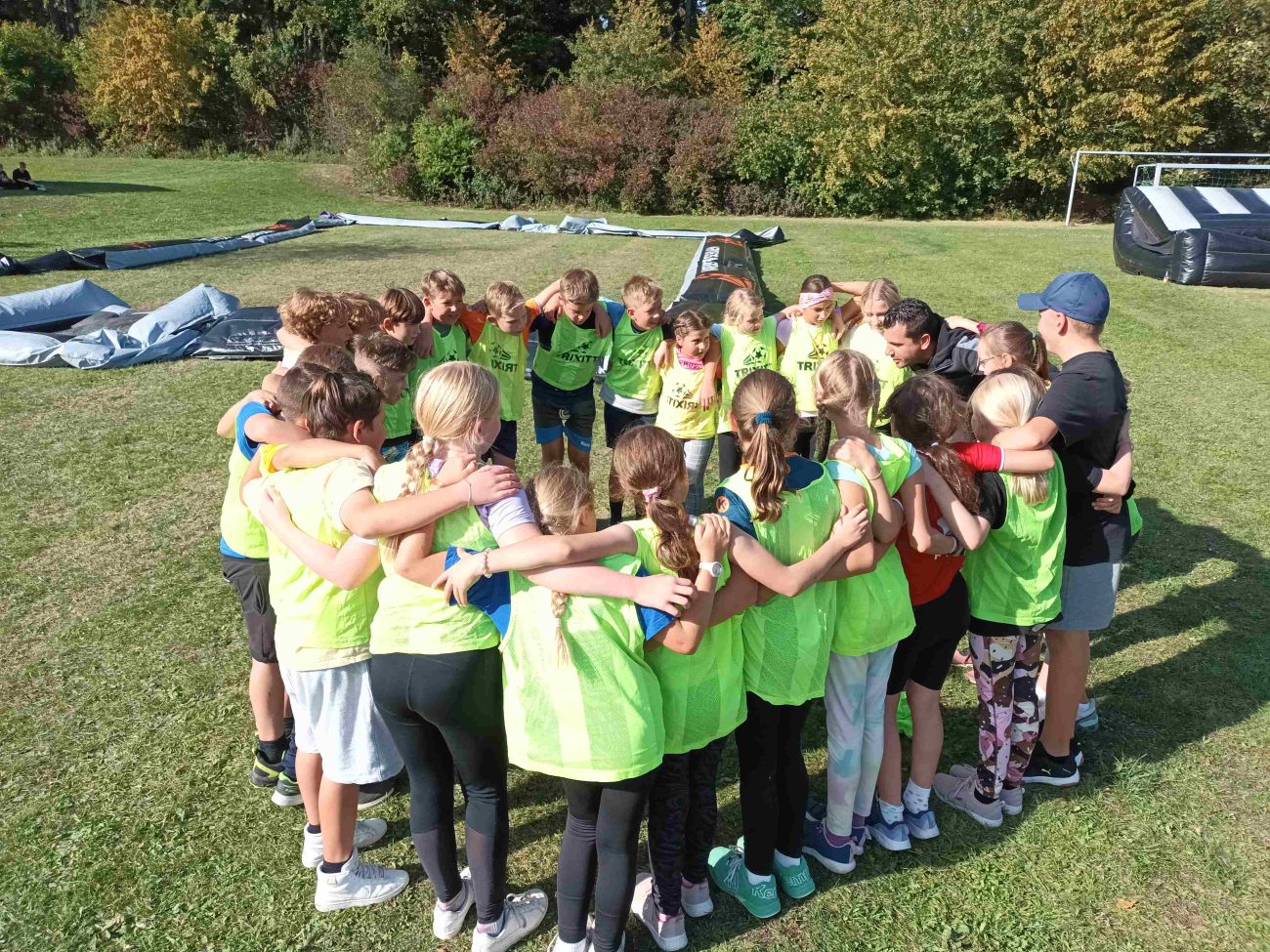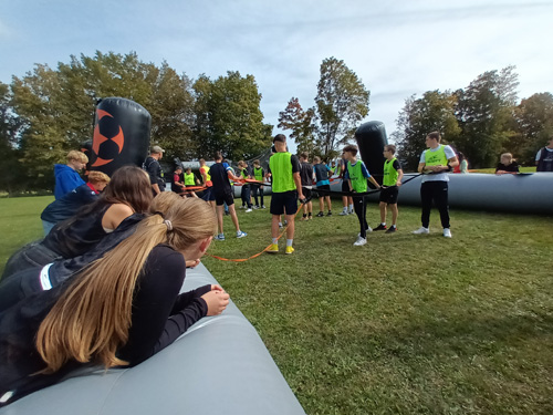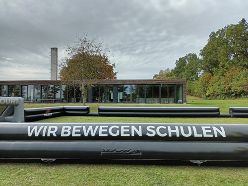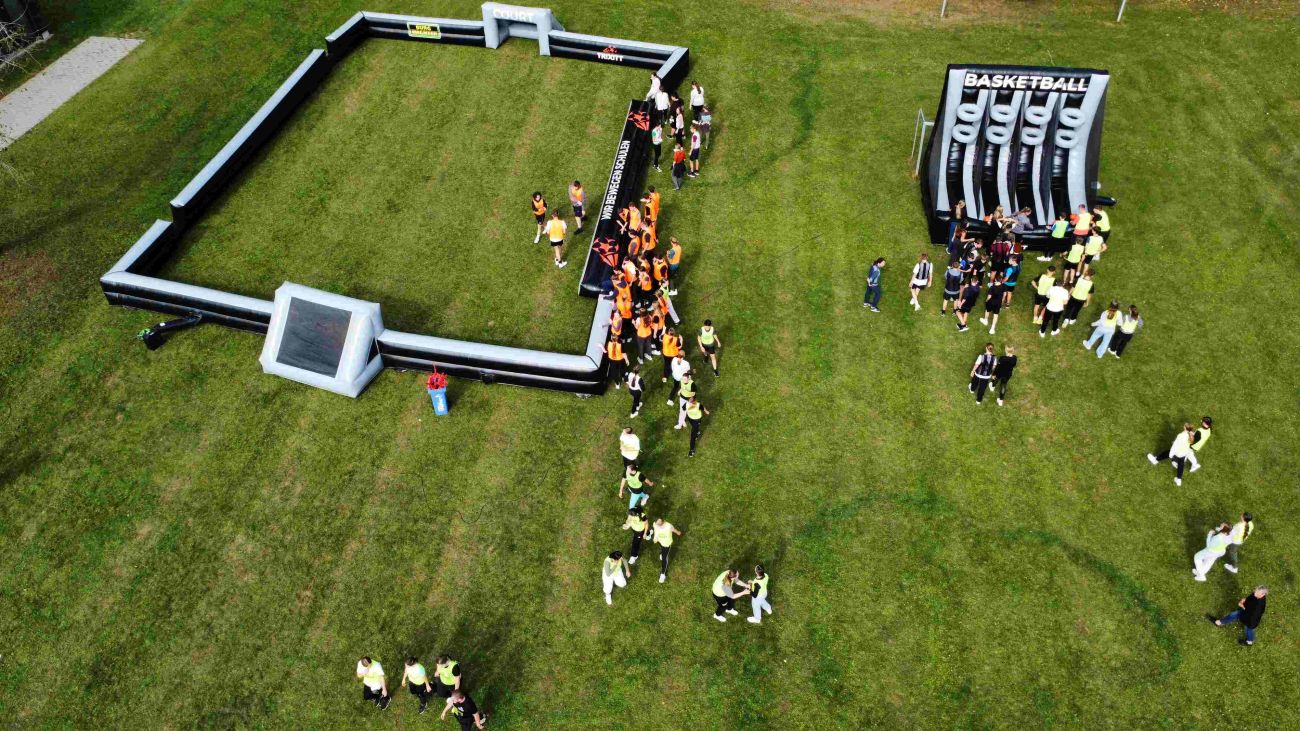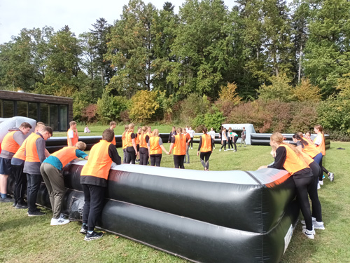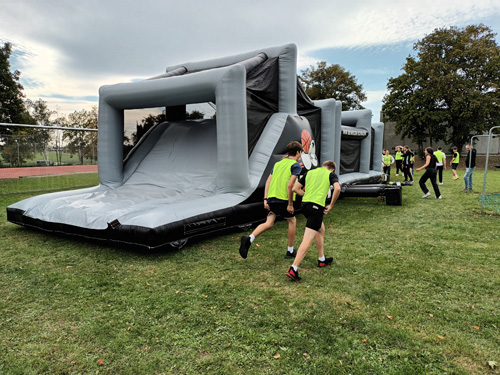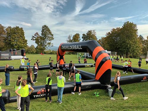Am 5. und 6. Oktober war mal wieder richtig was los auf der großen MKS-Wiese! Das Trixitt-Team aus dem Ruhrgebiet machte auf unserem Sportplatz Halt und warf die Gebläse an, damit sich um die 500 Schülerinnen und Schüler für ein paar Stunden gemeinsam auspowern konnten. Zunächst war Aufwärmen angesagt, dann ging es meist im Duell mit der Parallelklasse darum, am meisten Punkte für das Team zu holen. Beim Känguruh-Weitsprung musste ein Tennisball in die Tonne, im Menschen-Kicker galt es, geschickt den Ball ins gegnerische Tor zu lenken, was auch beim Kleinfeldfußball kein Problem für die Kinder und Jugendlichen war. An überdimensionalen Basketballkörben ernteten die Klassen ebenfalls eine Menge Score-Punkte, genauso wie auf den vielen Metern Laufstrecke, die sie bei der Laufchallenge zu absolvieren hatten. Auch Völkerball, ein Spiel, das die Kids mit ihren Sportlehrern öfters spielen, wurde im aufblasbaren Kleinfeld zur echten Gaudi. Absoluter Höhepunkt war jedoch der Hindernisparcours in Form einer riesigen Hüpfburg, in der die Klassen möglichst viele Durchgänge inklusive Kletterpassage und Rutsche zu passieren hatten, ein Riesenspaß, der vom Erst- bis zum Zehntklässler jeden begeisterte!
