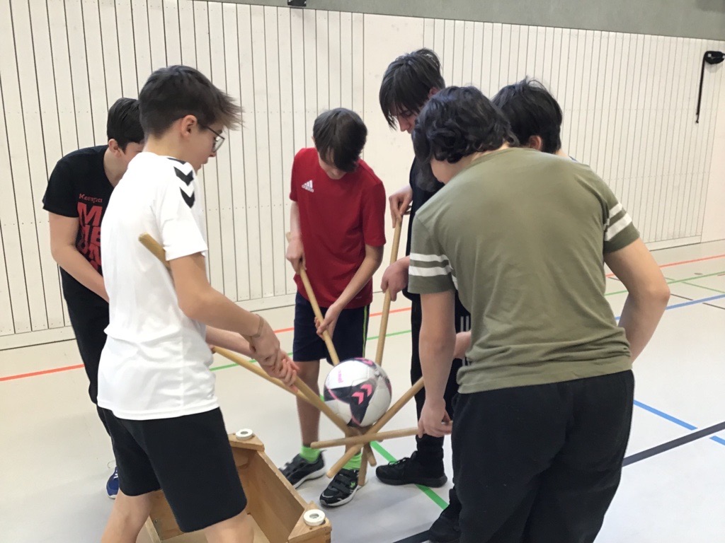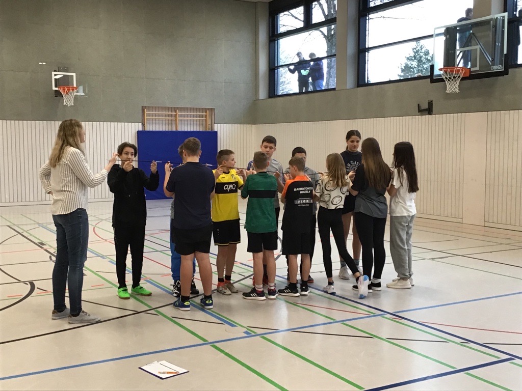 Der actionreiche Sporttag in der Turnhalle startete mit einer Präsentation, die den Schülerinnen und Schülern viele Einblicke in den Profihandball und Martin Strobels Karriere als Spielmacher der deutschen Nationalmannschaft gab. Teamgeist und Motivation waren zentrale Botschaften, die der inzwischen als Referent und Berater tätige Sportler an die gespannt lauschenden Siebt- und Achtklässler weitergab. Dann wurde die Theorie in die Praxis umgesetzt. Die Schülerinnen und Schüler sollten durch verschiedene Kooperationsspiele Strategien entwickeln, um als Gruppe die Aufgaben bestmöglich zu bewältigen. In Kleingruppen oder mit der ganzen Klasse wurden Handbälle zugeworfen, blitzschnell weitergegeben oder mit Stäben transportiert. Der Handballprofi begleitete die Gruppenaufgaben und gab allen hilfreiche Tipps. Die Jugendlichen hatten sichtlich Spaß und sind dabei als Team immer wieder an Grenzen gestoßen, die sie jedoch souverän gemeinsam überwinden konnten.