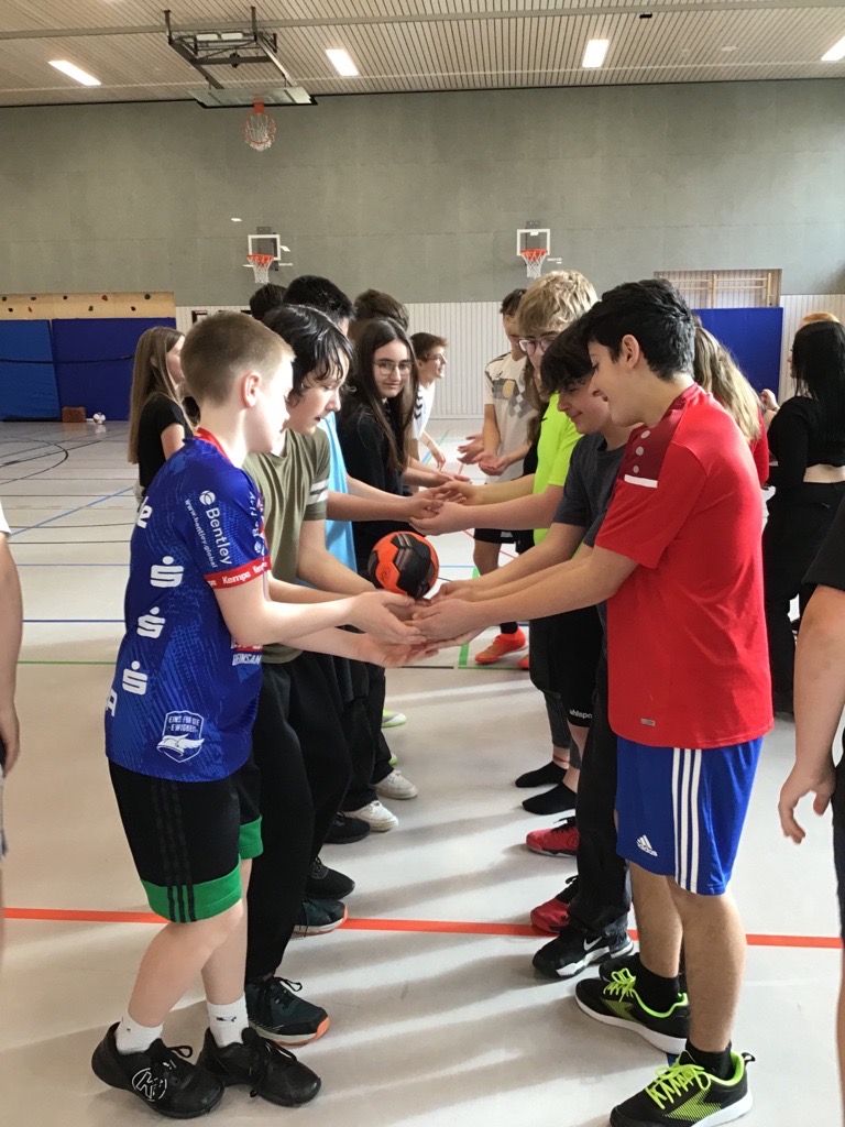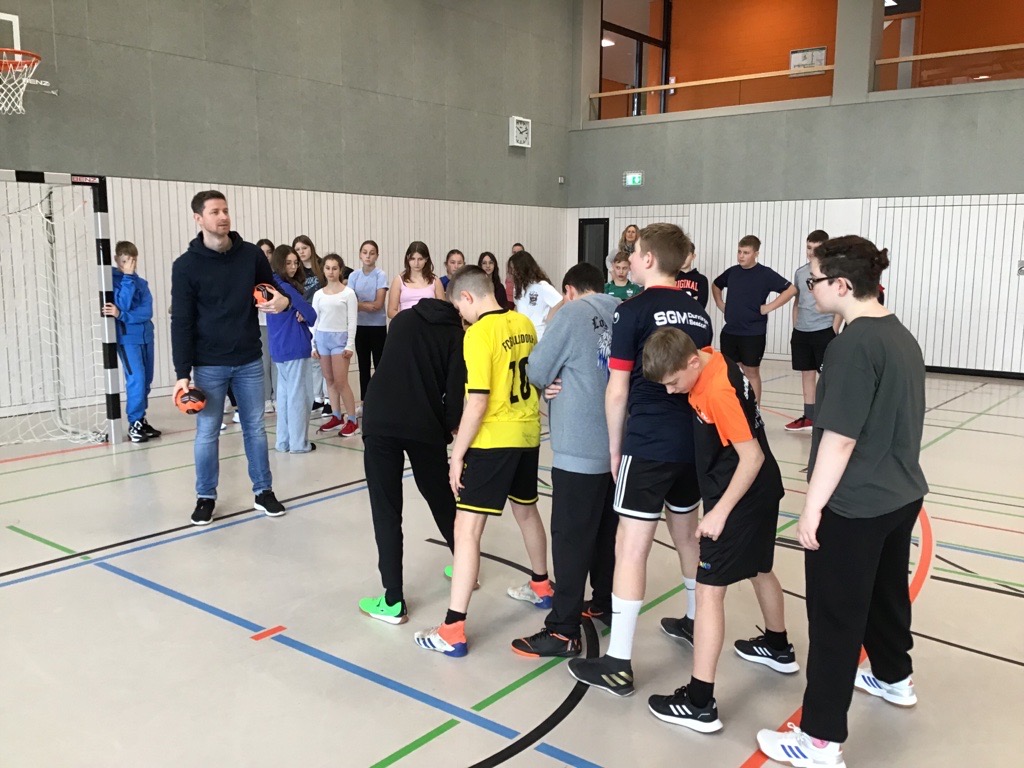 Einen etwas anderen Schulvormittag erlebten kürzlich die Klassen 7a und 8a, als der ehemalige Handballprofi Martin Strobel wieder einmal zu Gast an der Schule war, an der er seine Grundschulzeit verbrachte. Mit seiner Schultour „Spiel-den-Ball“ besucht er seit 2022 immer wieder Schulen, um einzelnen Klassen auf spielerische Weise und mit einem Hauch Handball-Feeling Teamgeist und ein Gemeinschaftsgefühl zu vermitteln, auf das es im Schul- und Berufsalltag immer wieder ankommt.