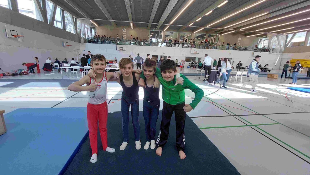 Die Jugendturner unter der Leitung von Herrn Schulz siegten im Kreisfinale, das im Januar in Spaichingen stattfand. Auf schneeglatten Straßen hatten sie zwar eine mühsame Anfahrt, wurden aber für ihre tollen Übungen und ihren Zusammenhalt im Team mit Gold belohnt. Ole Schanz aus der 4a, Niklas Bayer aus der 4b, Jan Seifried aus der 6a und Benedikt Kieninger aus der 6c haben sich damit fürs Bezirksfinale qualifiziert, welches sie Ende Februar in Villingendorf ebenfalls auf dem ersten Platz beendeten und sich darüber riesig freuten. Zum Landesfinale nach Überlingen fuhren sie Mitte März mit dem MKS Bus und erkämpften sich dort einen sensationellen zweiten Platz, welcher im Anschluss mit einem Besuch bei Mc Donald’s belohnt wurde. Die vier Turner samt ihrem Coach Herr Schulz waren überglücklich, das Team wuchs von Finale zu Finale immer mehr zusammen. Ihr Motto „alle für einen und einer für alle“ trieb sie zu Höchstleistungen an und sorgte für Teamgeist und Spaß bei den Wettkämpfen.