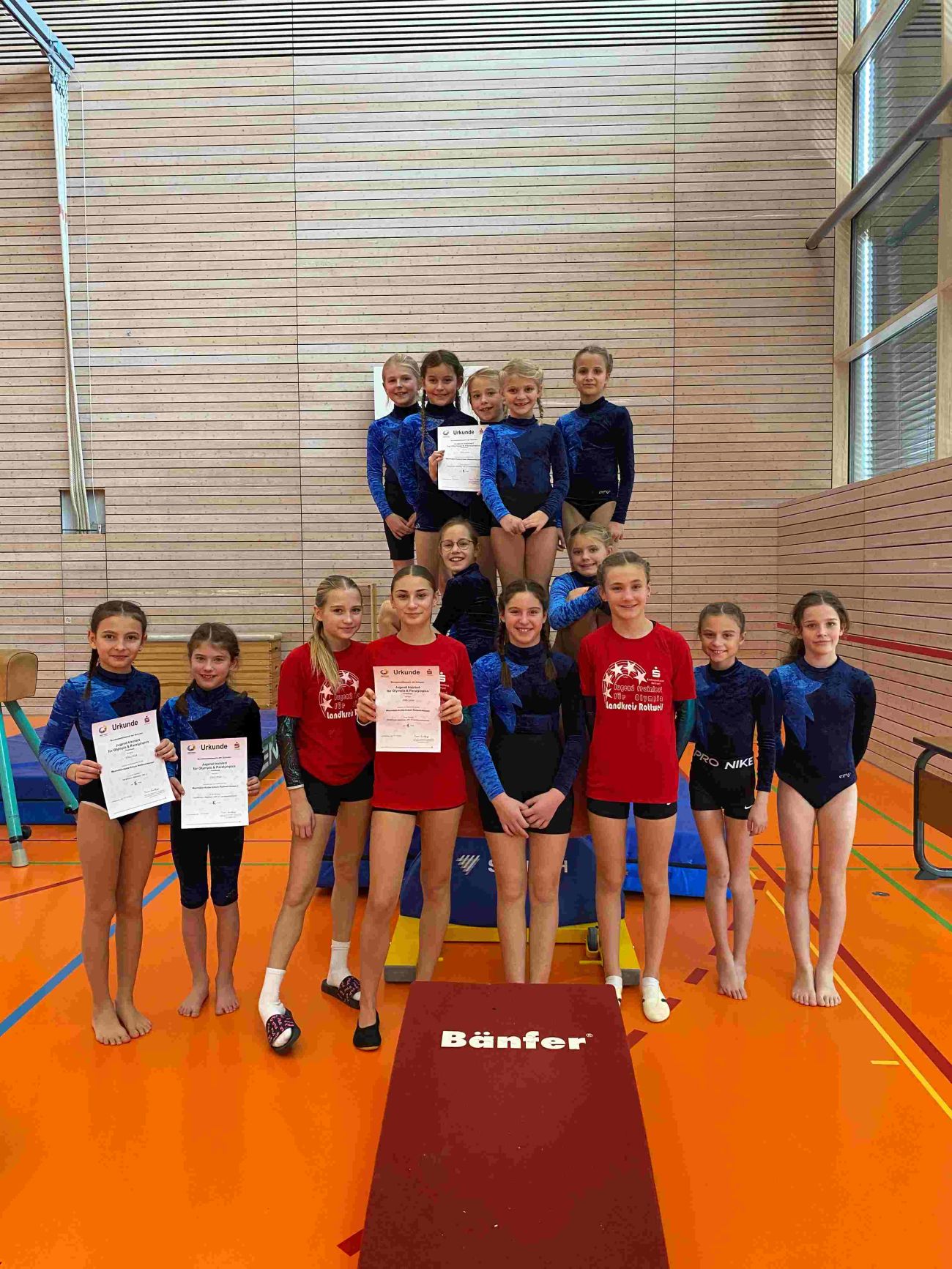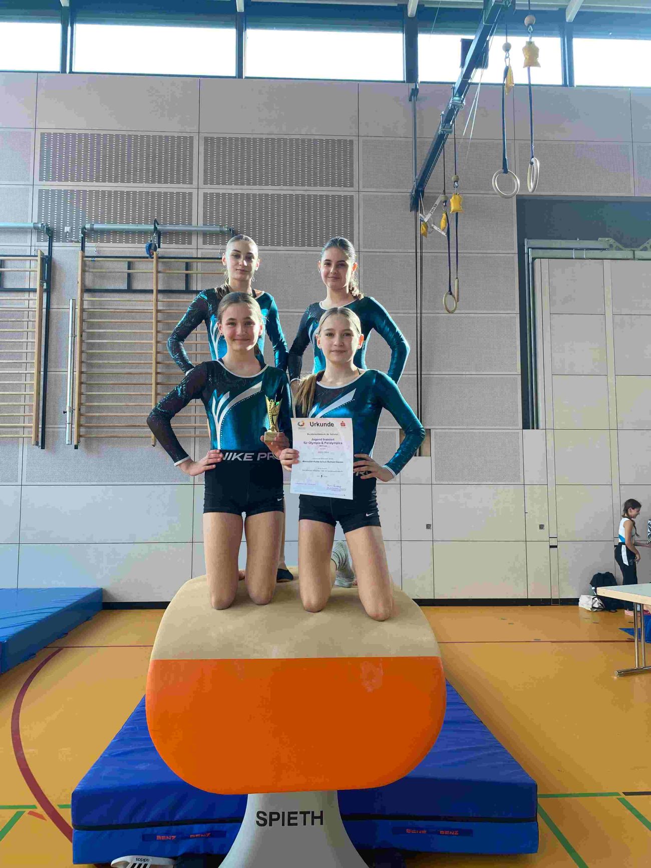 Doch auch die Mädchen erturnten sich mit mehreren Mannschaften in unterschiedlichen Altersklassen tolle 1., 4., 5., 6. und 9. Plätze im Kreisfinale und qualifizierten sich mit zwei Teams ebenfalls für das Bezirksfinale, welches sie mit einem 1. und einem 4. Platz Mitte Januar in Deisslingen stolz beendeten. Das Team mit Ellen, Ida, Luana und Dana qualifizierte sich hierbei zum RB- Finale Ende Februar in Villingendorf, das sie mit einem grandiosen 3. Platz abschlossen. Sie wurden begleitet von Frau Hain, Frau Ettwein und Frau Breiter.