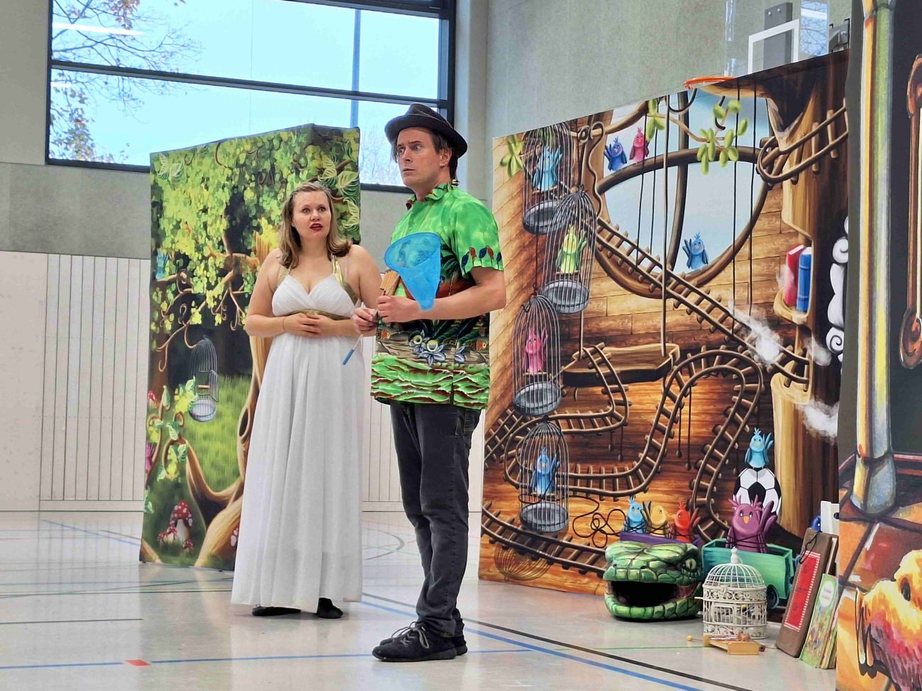 Die "Opernretter", ein Ensemble aus der Heidelberger Gegend war unserer Einladung gefolgt, um mit einem tollen Bühnenbild, vielen bunten Kostümen und fröhlichem Gesang den Vormittag mit unseren Grundschülern zu gestalten. Sie erzählten die Geschichte von der schönen Pamina, der Tochter der Königin der Nacht, die von Sarastro entführt wurde und vom Prinzen Tamino gerettet werden sollte. Zusammen mit Papageno, dem Vogelfänger, einer Zauberflöte und einem Glockenspiel, gelang es Tamino, drei schwierige Prüfungen zu bestehen und Pamina schließlich zu befreien. Auch Papageno zauberte sich mit seinem magischen Glockenspiel seine Papagena und gründete mit ihr eine Familie mit vielen Papagenis. Diese als Vogelkinder verkleideten MKS-Schülerinnen und Schüler hatten gleich zu Beginn sogar eine eigene Rolle in dem Stück, indem sie die Geschichte der Zauberflöte von ihren Eltern erzählt bekamen.
