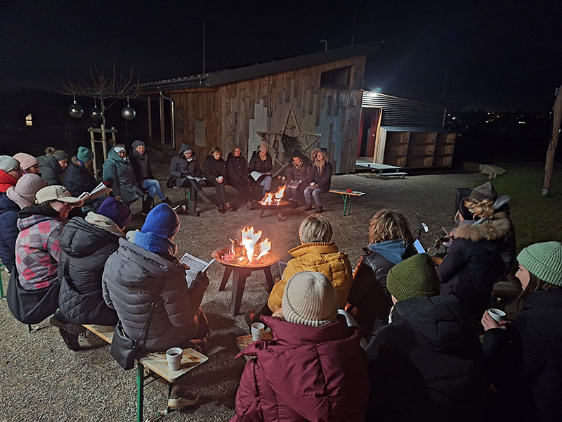 Der Einladung unserer Ganztagesmitarbeiterinnen Frau Sauter und Frau Merkl zu einer besinnlichen Adventsfeier am Naturhort waren am 12. Dezember viele Mitarbeiterinnen und Mitarbeiter gefolgt. Am wunderschön dekorierten und beleuchteten Naturhort starteten wir in der Dämmerung zu einer Fackelwanderung durch den Hausener Wald bis zur Kapelle, wo umrahmt von brennenden Kerzen ein meditativer Impuls von Frau Jorga folgte. Zeit für Besinnung im hektischen Alltag und Zeit, um sich gedanklich mit "Engeln auf Erden" zu beschäftigen, wozu es eine nachdenkliche Geschichte gab.