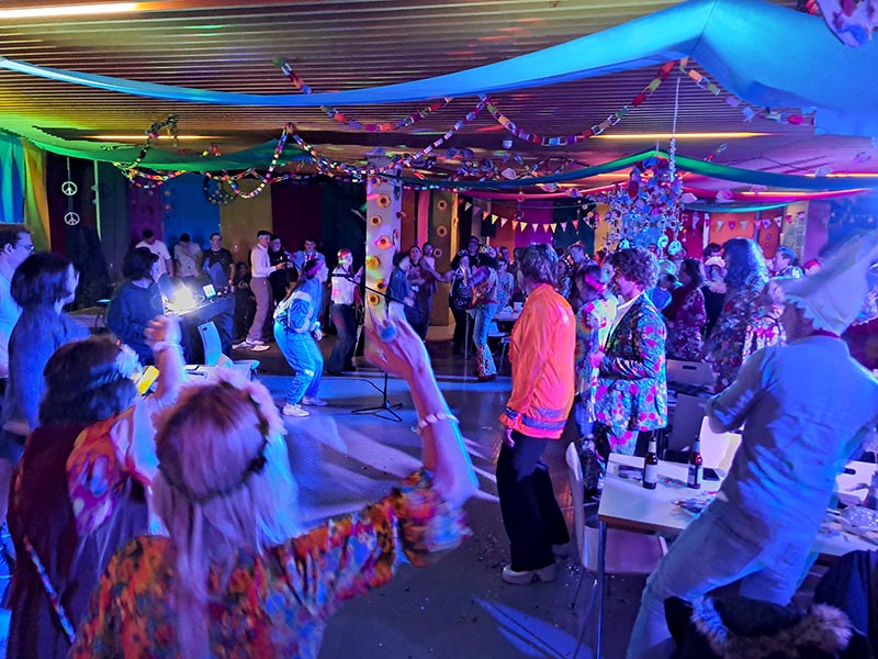 Der Kolbeball am 21. Februar lud wieder einmal zahlreiche Eltern, Ehemalige und Mitarbeiter in die farbenfroh geschmückte Mensa ein. Schon Wochen zuvor bastelten die Klassen eifrig Prilblumen, Peace-Zeichen, Blumengirlanden und vieles mehr, um die Party-Location entsprechend dem Motto 70er-Jahre schön bunt herzurichten. Und das tat unser Projektteam mit Unterstützung der Tontechniker auch, stundenlang wurde aufgebaut, dekoriert, verkabelt und vorbereitet, bis die gut gelaunten Gäste nach einem Willkommensdrink schließlich ins Blumenmeer eintauchen durften. Zahlreiche Auftritte von Lehrkräften und Mitarbeitern, aber auch einer Hausener Tanzgruppe sorgten neben einiger kulinarischer Highlights aus der MKS Küche für eine tolle Einstimmung in die Mottoparty. Nach vielen lustigen und unterhaltsamen Programmpunkten hielt es dank DJ Seamless alias Tobias Eichinger jedoch niemanden mehr auf den Stühlen. Ununterbrochen legte er einen Hit nach dem anderen auf und sorgte so für eine 4-stündige bombastische Tanzparty an seiner ehemaligen Schule.