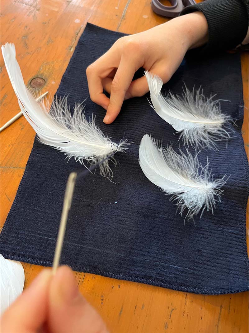 Das engagierte Team von Frau Beck, der Mutter unserer FSJlerin Elisa, unterstützte die Kinder tatkräftig bei ihren kreativen Projekten. Unter Anleitung lernten die Kinder, Federn von Hand zu nähen und das Wickeln von Fransen zu meistern. Sie waren äußerst eifrig und zeigten viel Kreativität, was zu wunderschönen Unikaten führte, die sie stolz mit nach Hause nehmen konnten.