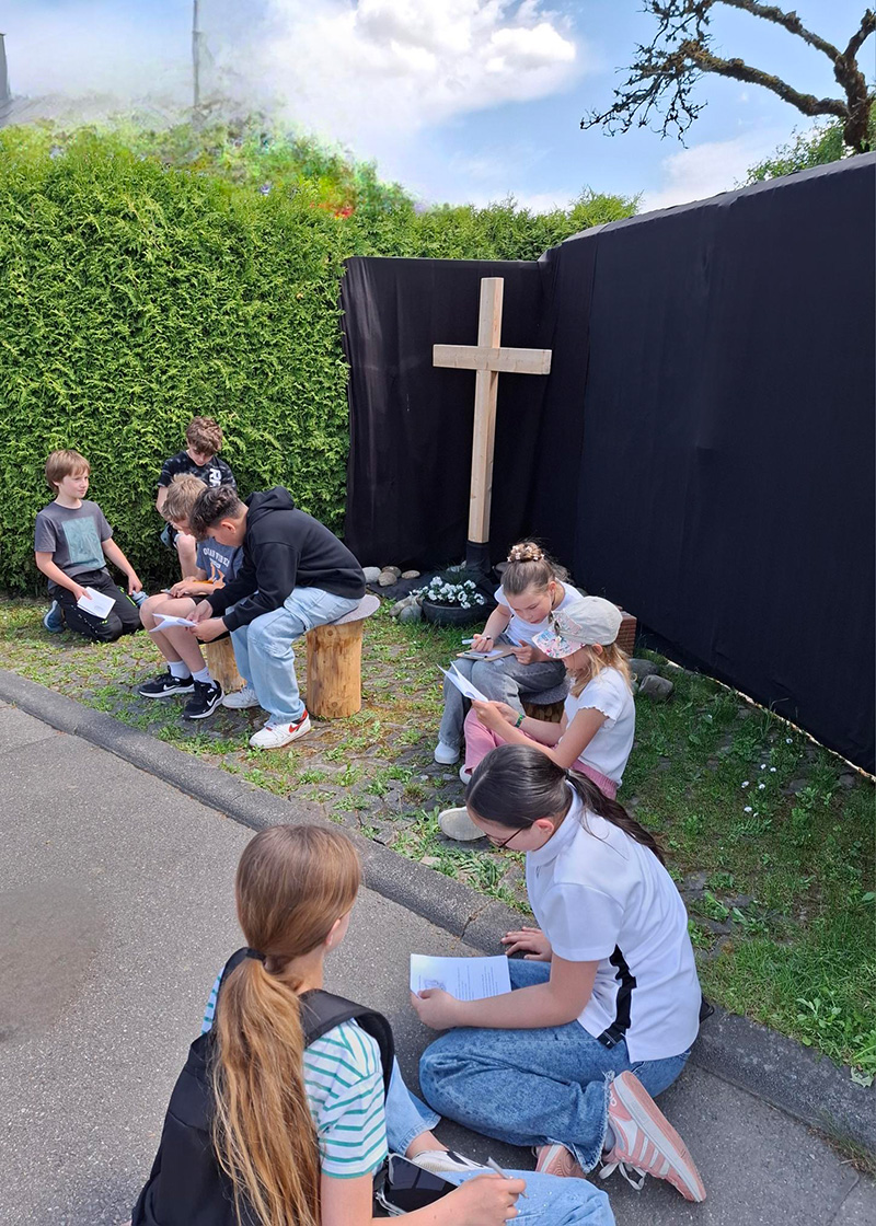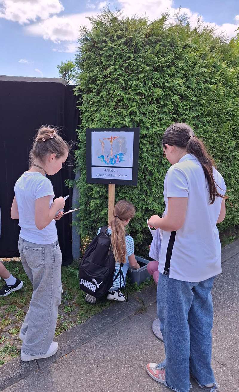 Am Donnerstag Nachmittag konnten wir, die Klasse 5c einen besonderen Nachmittag auf dem Auferstehungsweg in Hausen erleben. Wir trafen Frau Müller an der Kirche und teilten uns in drei Gruppen auf. Frau Adam, Frau Müller und unserer Klassenlehrerin begleiteten uns auf dem Weg durchs Dorf.