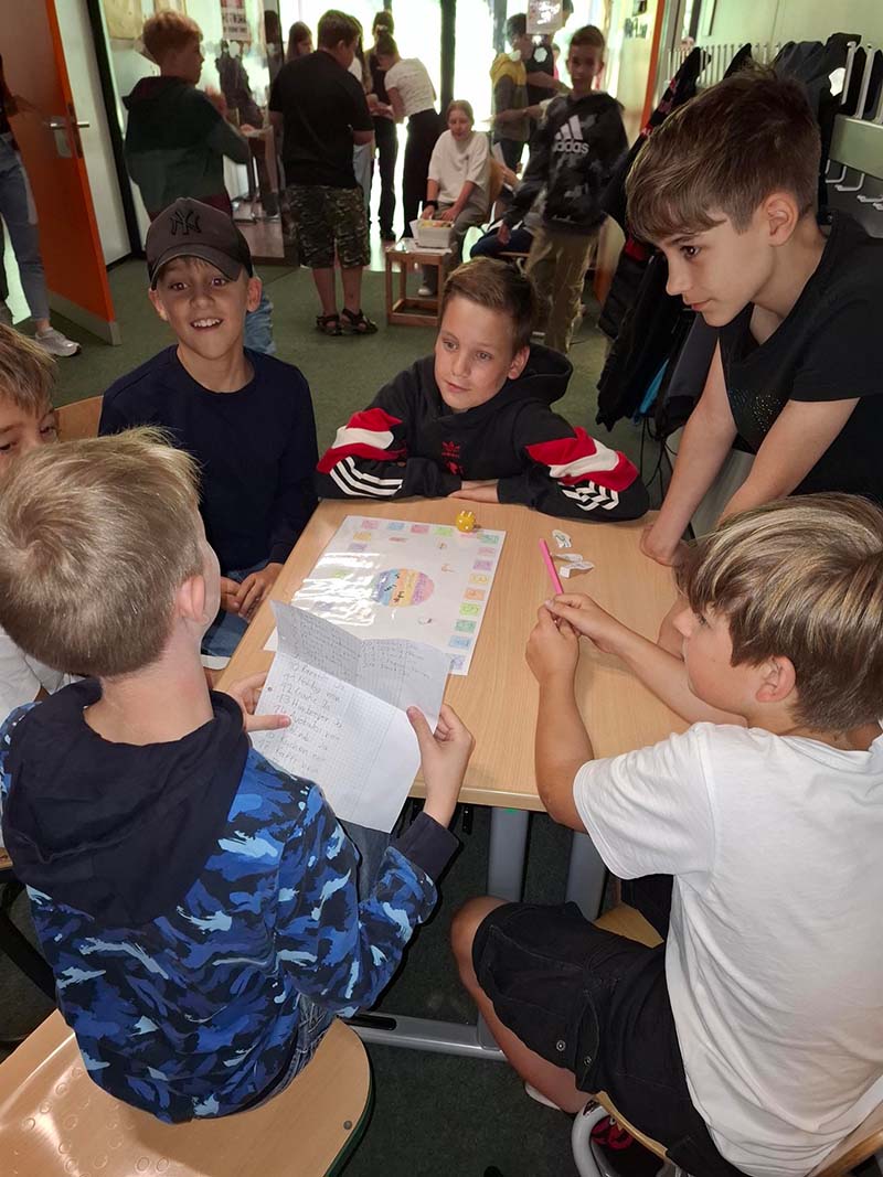 Bei der gemeinsamen Ausstellung am Donnerstag präsentierten die Klassen stolz ihre Ergebnisse und man sah den Schülerinnen und Schülern die Freude und den Spaß an der gemeinsamen Projektarbeit förmlich an. Mit einer Stempelkarte durften sich die Klassen gegenseitig besuchen und ihre Projekte erklären oder auch mal bei einem Quiz mitmachen.