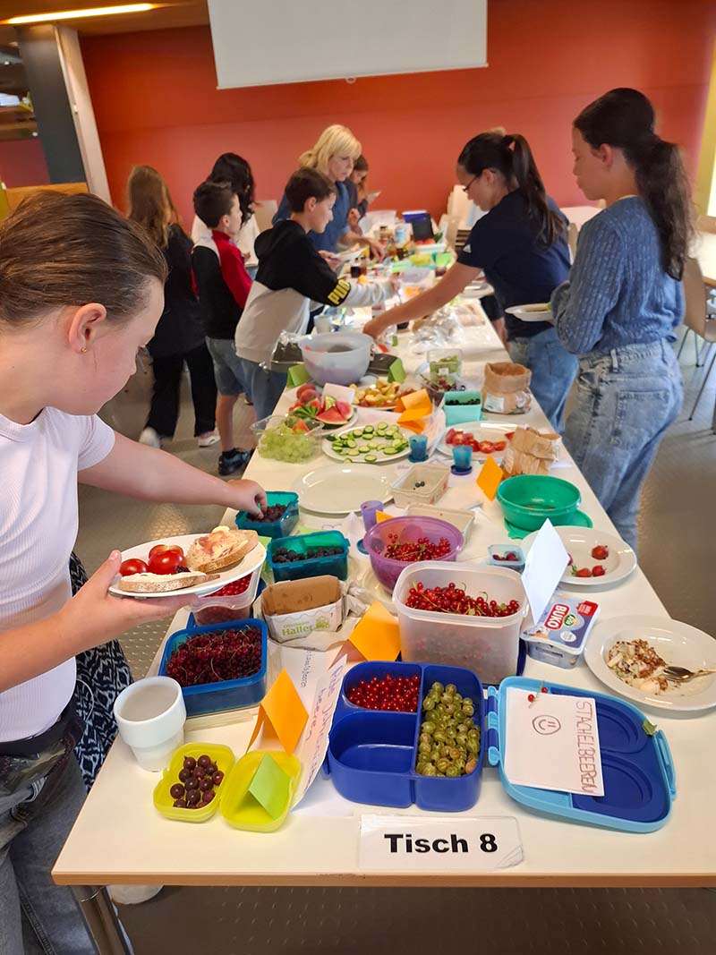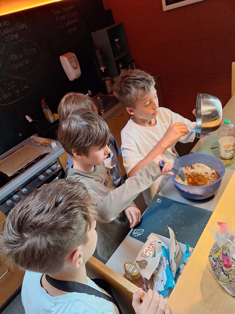 Die Fünfer haben unser Essen und z.B. Nahrungsverpackungen genau unter die Lupe genommen. Was steckt drin in unserem Essen, was kaufen wir ein oder wie könnten wir es auch selbst herstellen? So wurde in der Schulküche und im Schülercafé eigenes Müsli hergestellt. Das knusprige Granola u.a. aus Nüssen, Haferflocken, Kernen und Honig erfreute sich beim nachhaltigen Frühstück in der Mensa großer Beliebtheit. Beim (Alt)-Papierschöpfen und Baumwoll-Taschen bedrucken waren sie zusätzlich kreativ unterwegs.