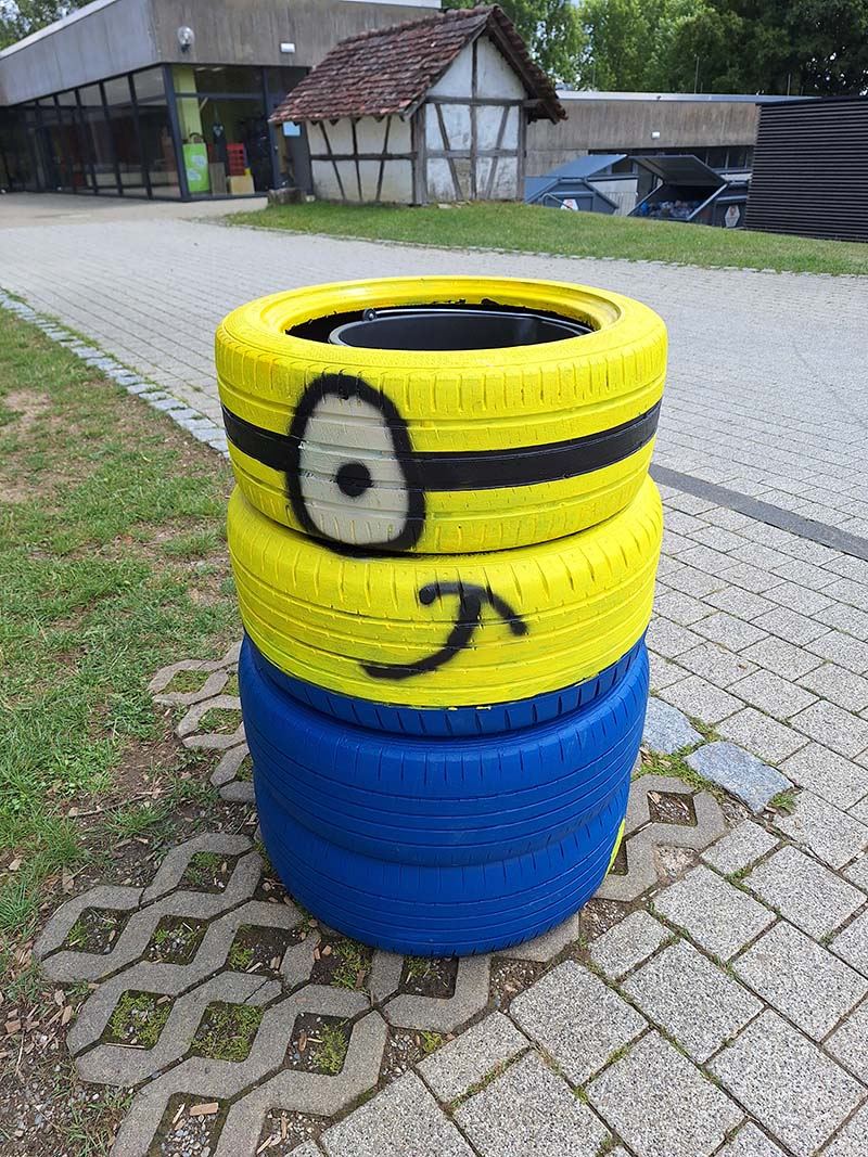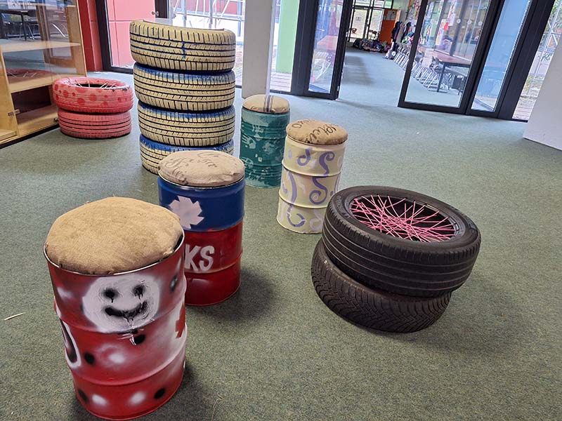 Die Achter waren zu "Wie kann ich beim Thema Nachhaltigkeit Einfluss nehmen?" sehr praktisch unterwegs und haben sich u.a. mit Upcycling beschäftigt. Aus alten Autoreifen und Fässern haben sie Mülltonnen und Sitzgelegenheiten gebaut, die bunt bemalt nun die MKS und die Schulhöfe schmücken. Auch mit nachhaltiger Landwirtschaft und fairem Tabakanbau haben sie sich beschäftigt.