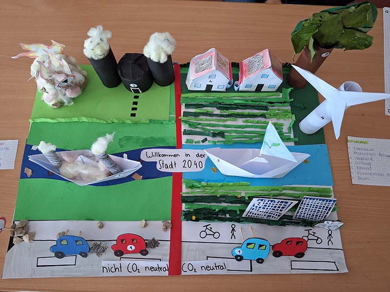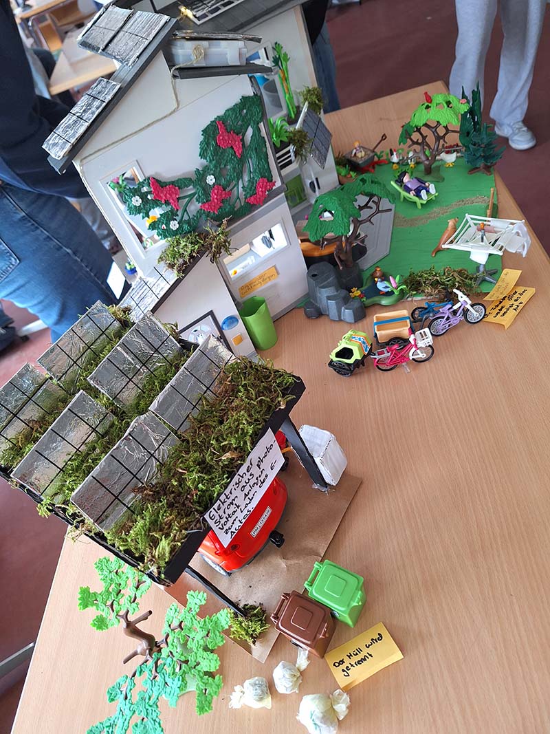 Die Stufe 9 hatte das große Thema Energie zur Aufgabe und war hierzu in Gruppenarbeit sehr kreativ. Die Energieformen Sonne, Wind, Wasser und Biomasse wurden erarbeitet und verglichen und nachhaltige Häuser und Städte wurden gebastelt. Dabei kamen die eigenen Playmobilfiguren ebenso zum Einsatz wie digitale Medien z.B. zum virtuellen Bau einer nachhaltigen Minecraft-Welt. Noch mehr digitale Projekte waren das Video der Klasse 9c und der Klasse 9a mit der 2a.