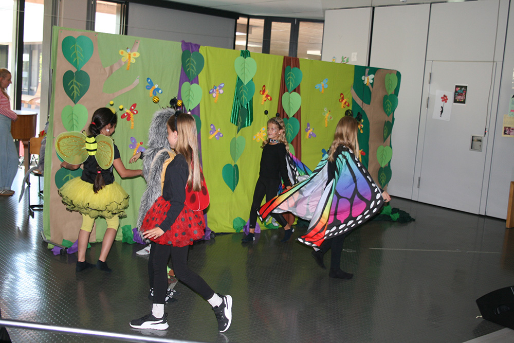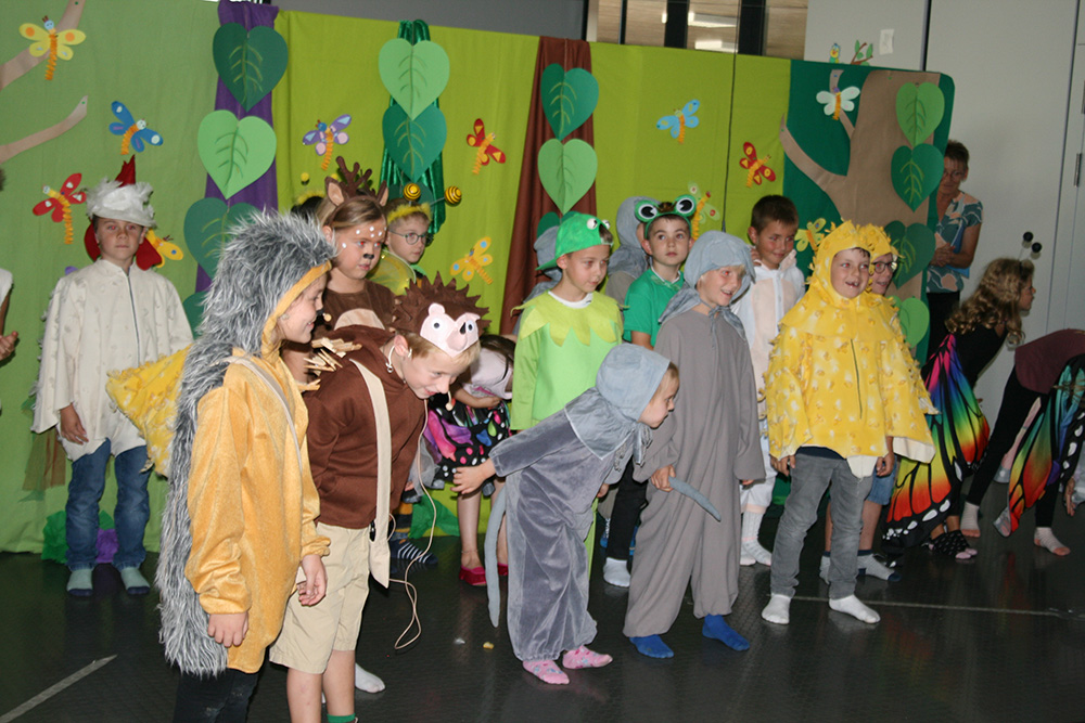Am 18. und 19. September fanden die Einschulungsfeiern unserer neuen ersten Klassen statt. Bei schönstem Sommerwetter feierten wir in unserer Aula Gottesdienst und begrüßten die Kinder mit einem tierischen Theaterstück. Die Klasse 2c mit ihrer Lehrerin Frau Martinkewitz hatte sich nämlich bereits vor den Sommerferien mit dem Einüben beschäftigt und so klappte beim Auftritt alles wie am Schnürchen. Der kleine Igel und seine Freundin machten sich auf die Suche nach der "schönsten Sache der Welt" und befragten dazu alle Tiere des Waldes. Eichhörnchen, Frösche und Mäuse dachten dabei nur ans Essen, Schmetterlinge und Bienen an warme Sonnenstrahlen und leuchtende Blüten und der Hahn wünschte sich, dass seine Hennen weniger streiten. Doch das war irgendwie nicht das, was die kleinen Igel hören wollten. Schließlich fanden sie am Ende heraus, dass Freundschaft das Allerwichtigste ist im Leben, weil man sich auf seine Freunde einfach immer verlassen kann.