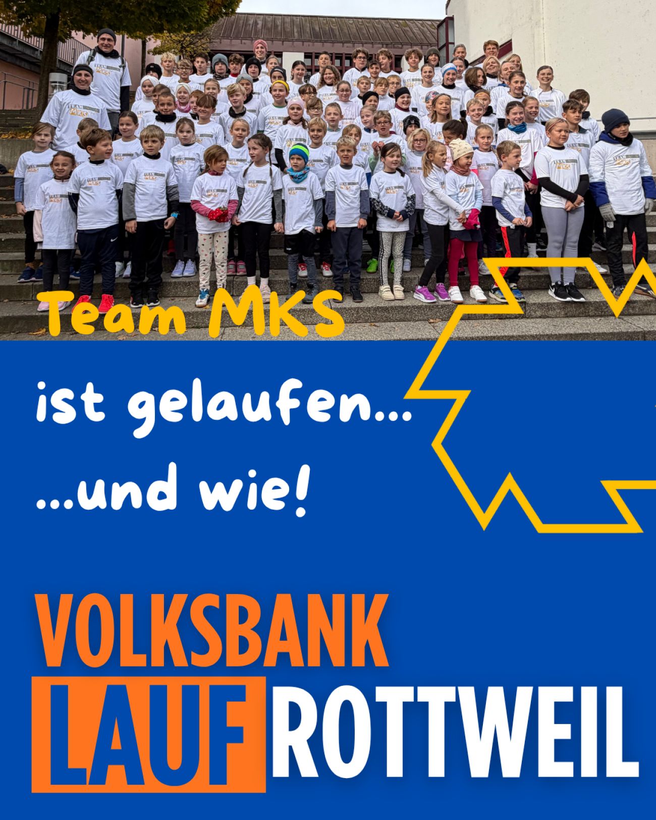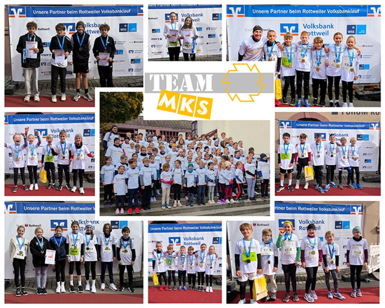 Um die 1000 Teilnehmer, so viele wie noch nie, machten mit beim diesjährigen Rottweiler Volksbanklauf, auch wir von der MKS waren erstmals mit 15 Staffeln vertreten und haben unsere Schule in nagelneuen Lauf T-shirts toll präsentiert.